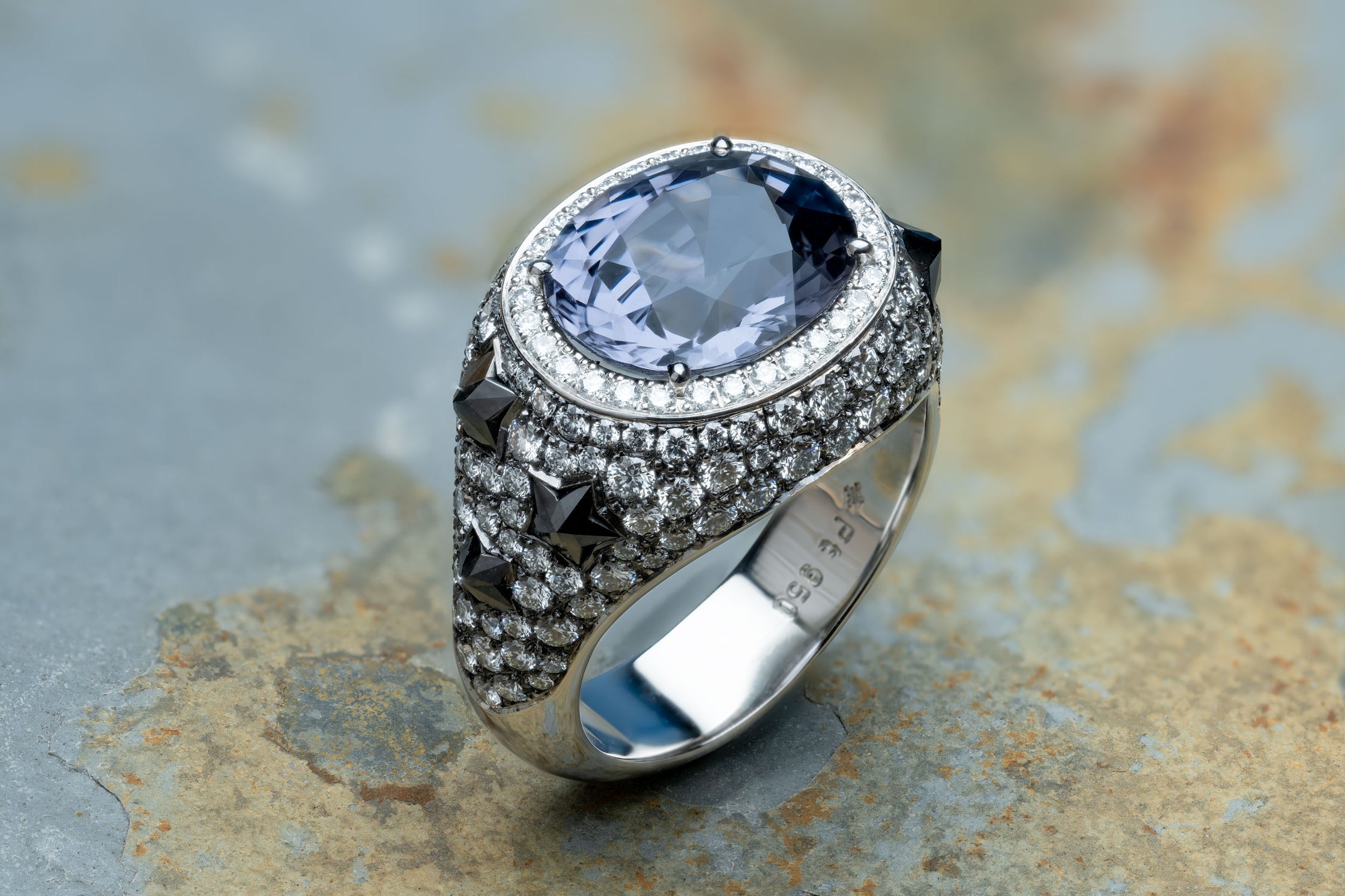 Platin Ring mit 1 Burma Spinell, weissen Brillanten und 6 schwarzen Diamant Sternen