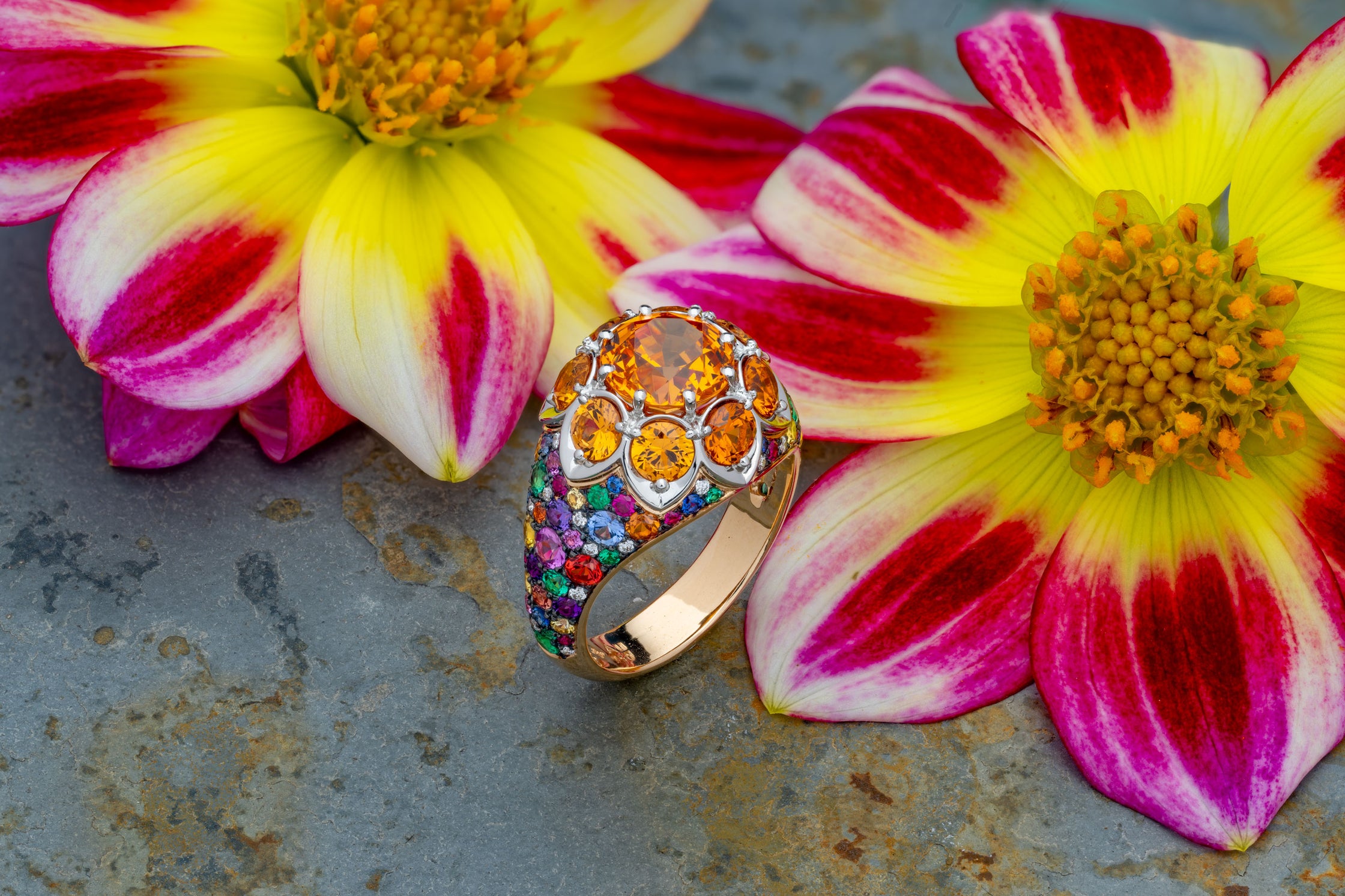 Candy Weissgold Ring mit Blume mit total 9 Spessartinen und Pavé mit verschiedenfarbigen Safiren und Granaten