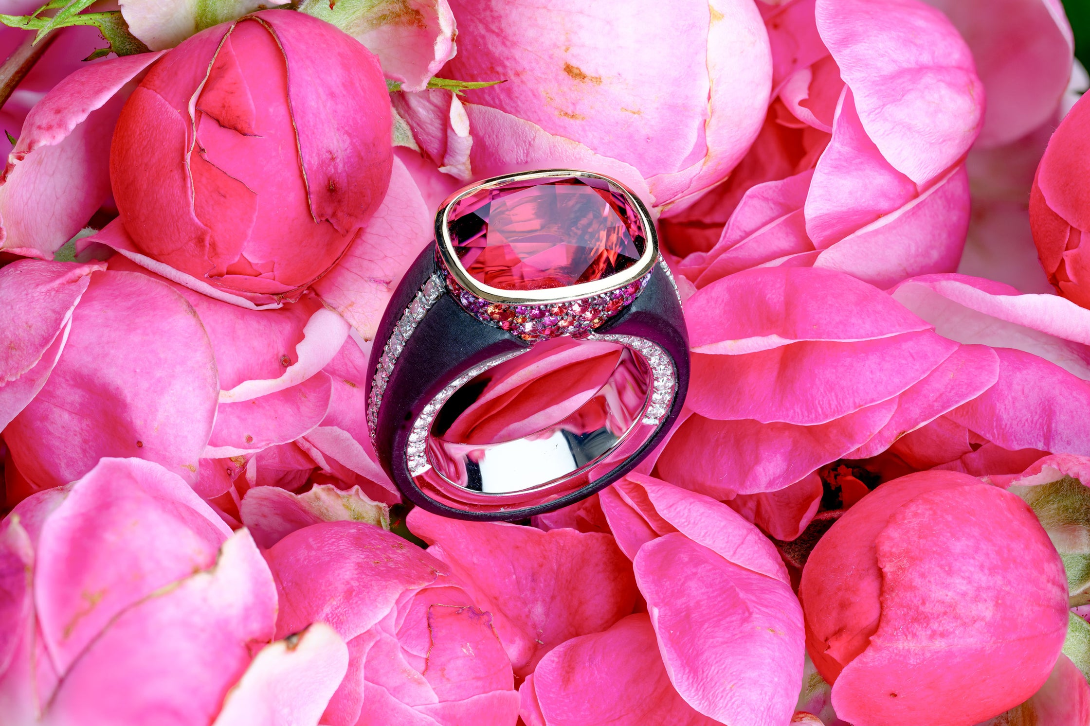 1 Ring in Roségold und Platin mit 1 pink Turmalin und Brillanten mit Carbon Ringschiene und Candy Fassung mit verschiedenfarbigen Safiren